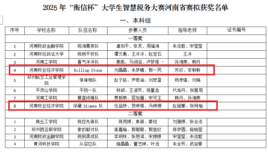 10月25日,由河南省高等教育学会主办的2025年“衡信杯”河南省大学生智慧税务大赛在河南财政金融学院落下帷幕。经过与省内40多所本科高校、77支队伍的激烈角逐,suncitygroup太阳集团派出的两支参赛团队凭借扎实的专业功底、娴熟的实操技能和稳定的临场发挥,全部荣获本科组一等奖的优异成绩,充分展现了我校学子的卓越风采和财税人才培养的扎实成果。