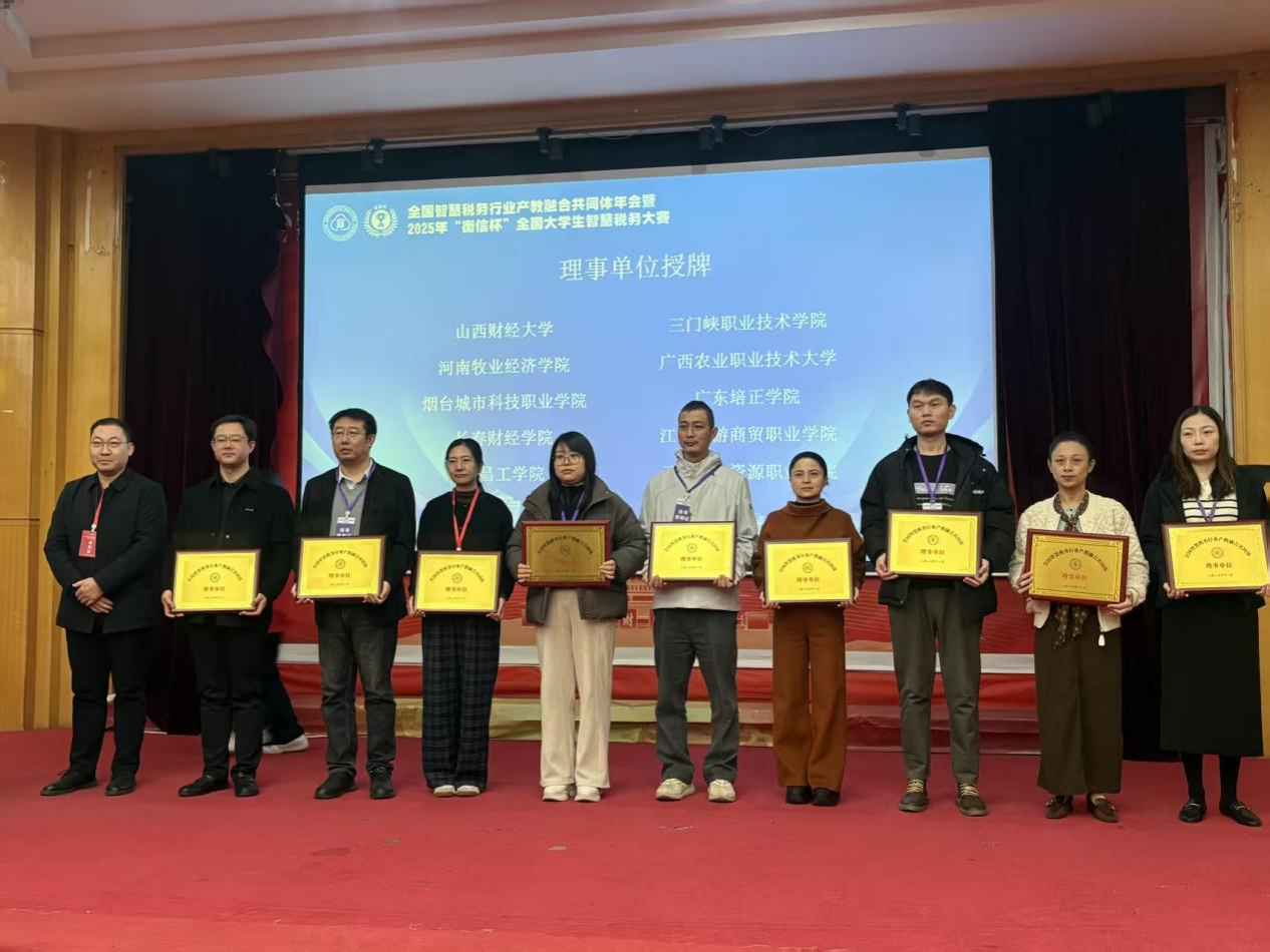 大赛期间,2025年全国智慧税务行业产教融合共同体年会同步举行。年会上,我院作为共同体新加入院校,接受了新增理事单位的授牌。会上还颁发了最佳组织奖等奖项,我院凭借精心的组织及优异的成绩,被授予“最佳组织奖”。