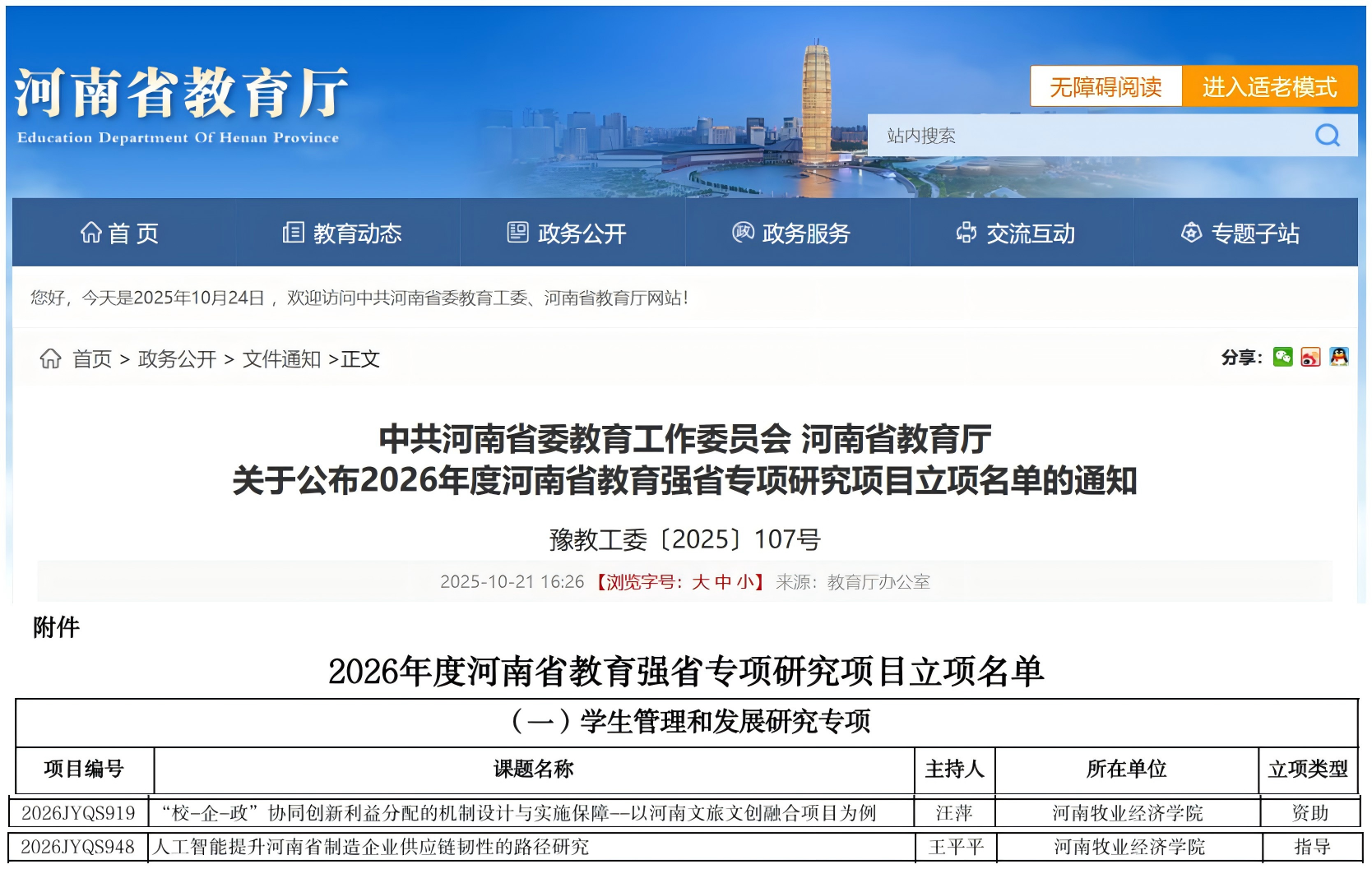 近日,中共河南省委教育工作委员会、河南省教育厅公布了2026年度河南省教育强省专项研究项目立项的通知,我院汪萍老师的《“校-企-政”协同创新利益分配的机制设计与实施保障——以河南文旅文创融合项目为例》和王平平老师的《人工智能提升河南省制造企业供应链韧性的路径研究》2个项目获批立项,其中汪萍老师的项目获得经费资助支持。