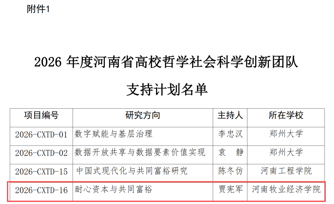 近日,中共河南省委教育工作委员会、河南省教育厅下发了《关于公布2026年度河南省高等学校哲学社会科学创新团队支持计划的通知》(豫教工委〔2025〕116号),我院院长贾宪军教授主持的“耐心资本与共同富裕”(项目编号:2026-CXTD-16)成功入选该支持计划。