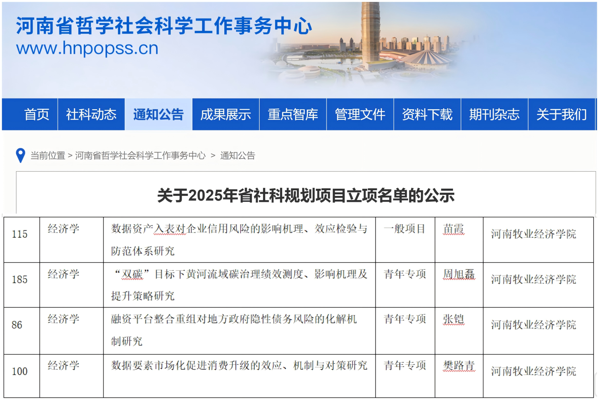 近日,河南省2025年度省社科规划项目立项公示,我院科研工作再添佳绩。苗霞、周旭磊、张铠、樊路青四位博士成功斩获立项,创学院该类项目年度立项数量历史新高。此次立项佳绩的取得,是我院持续深化有组织科研、着力提升科研质量的阶段性成果。