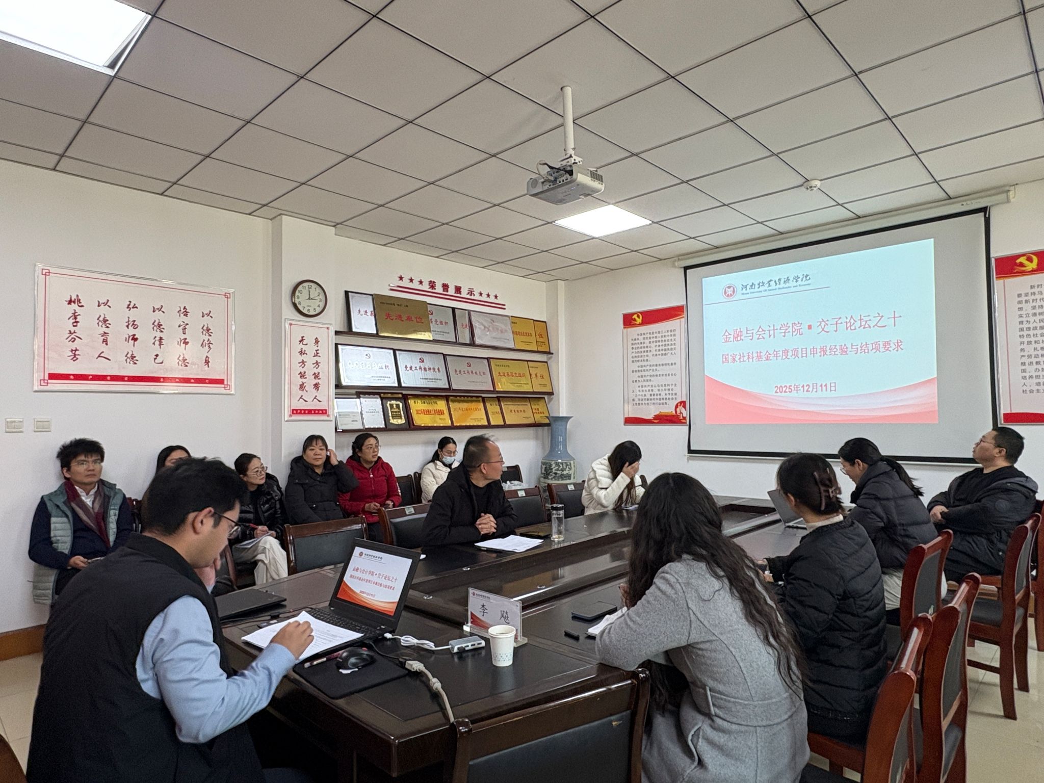 2025年12月11日下午,金融与会计学院在教学楼514会议室举办国家社科基金申报专题指导讲座,特邀郑州大学商学院李飚教授担任主讲,围绕“国家社科基金申报、执行与结题”开展系统讲解,并对学院教师的申报课题进行现场点评与指导。学院博士、部分教师及兄弟学院教师参加了此次讲座,讲座由suncitygroup太阳集团院长贾宪军教授主持。