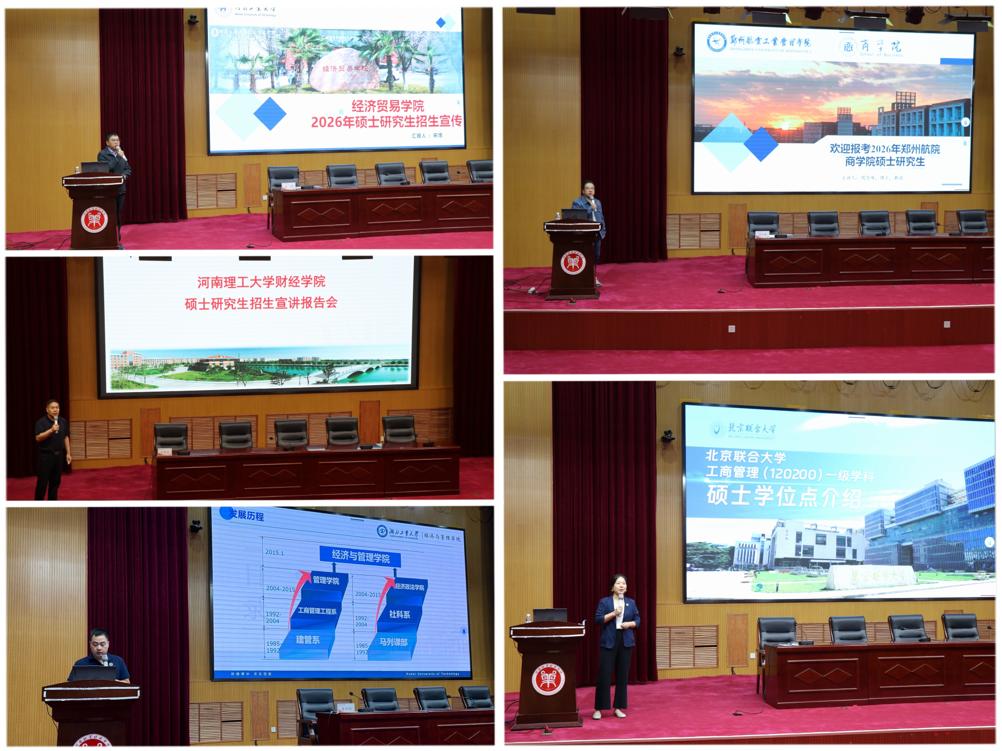 为帮助学生深入了解研究生招生规则,精准把握最新招考动态,积极顺应教育改革方向,9月18日下午,我院邀请河南理工大学、河南工业大学、郑州航空工业管理学院、湖北工业大学、北京联合大学等5所高校在学术报告厅举办研究生招考政策宣讲会,为有志深造的学子搭建信息沟通桥梁。本次宣讲会由我院党委副书记汪晓伟主持,相关专业同学参加。