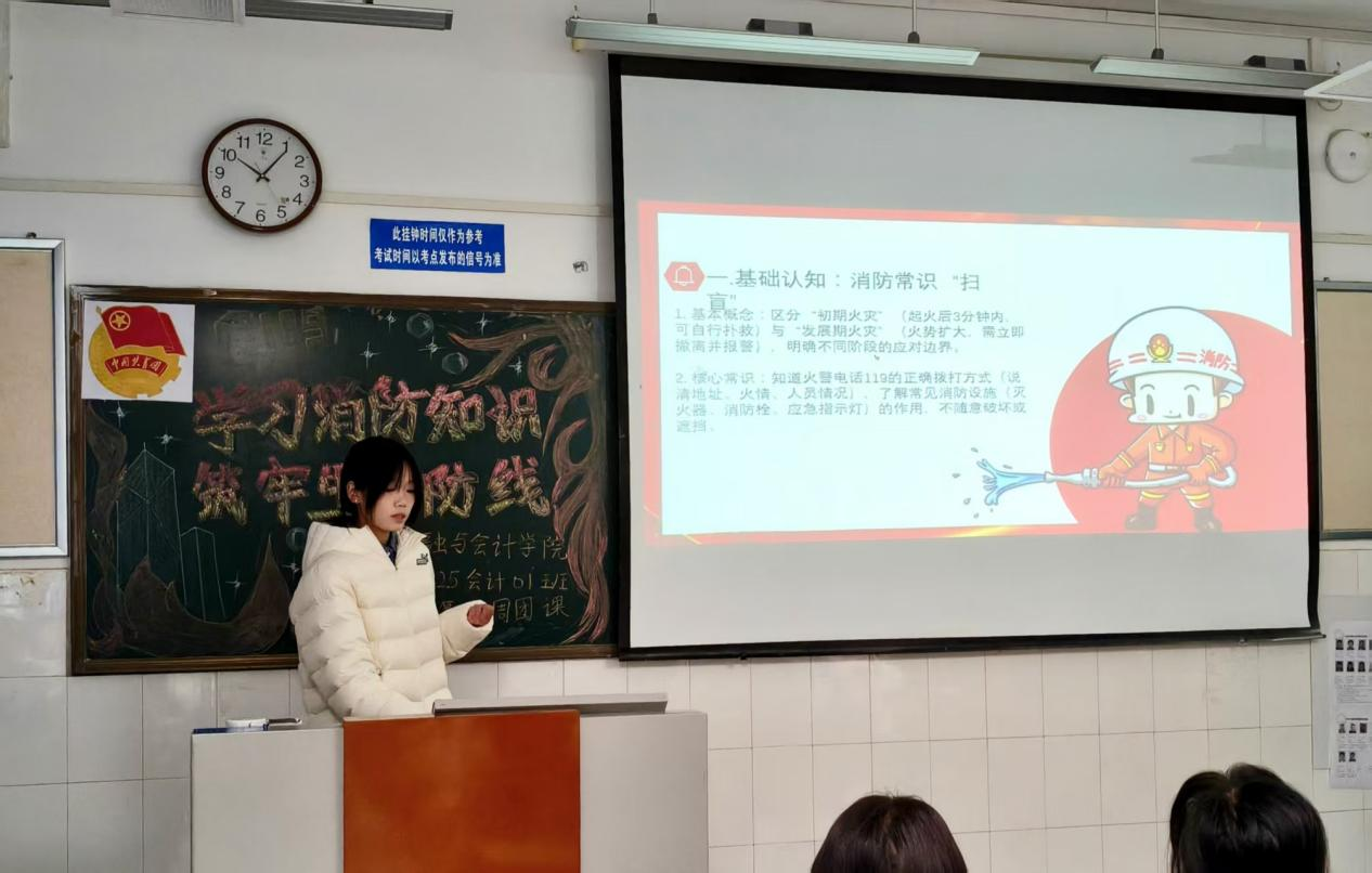 在嘹亮团歌声中,各班团课活动有序展开。活动伊始,各班团支书通过一系列触目惊心的火灾案例视频,向同学们直观地展示了火灾的巨大危害,增强大家对生命安全问题的关注。接着,各班团支书带领同学们深入学习如何正确扑救火灾、自查自消身边安全隐患、火场逃生自救方法等一系列消防安全知识,使同学们深刻领悟到“预防为主、防消结合”的安全理念。大家纷纷表示,今后会将所学知识运用到生活中,主动排查身边隐患,同时积极向家人、朋友普及消防知识,争做消防安全的践行者和传播者,用实际行动守护自身和他人的生命财产安全。